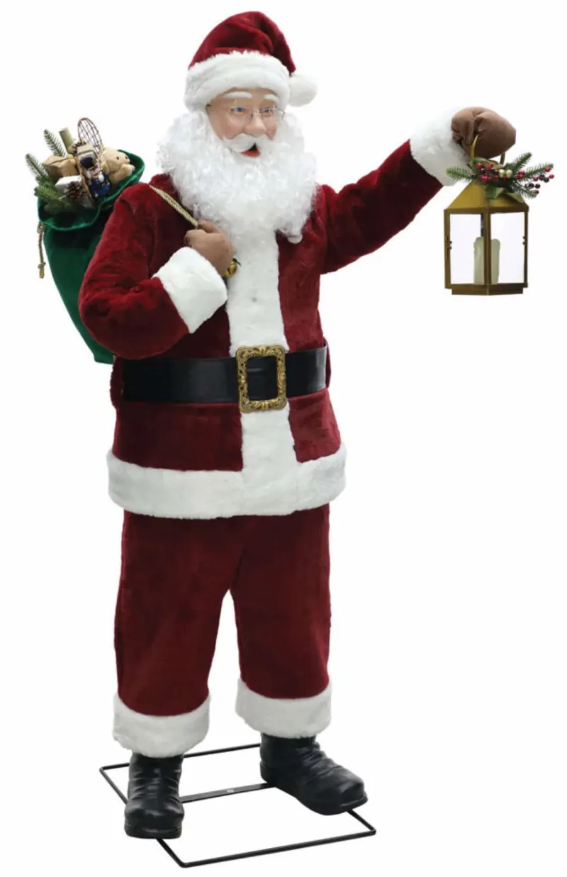 Bring the magic of Christmas to life with this stunning 1.8m Deluxe Santa Greeter Figure. Dressed in his traditional red velvet suit trimmed with plush white faux fur, Santa holds a festive lantern in one hand and a sack full of holiday treasures slung over his shoulder.