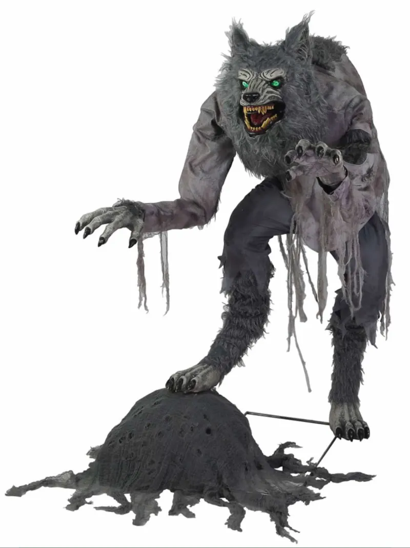 When activated, the Lanky Werewolf growls, snarls, and thrashes with menacing movement, creating a heart-stopping encounter for anyone who dares to cross its path. Dressed in tattered clothes that hang from its bony frame, this figure captures the perfect mix of beastly savagery and eerie realism.